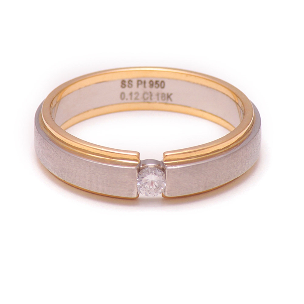 Two tone single diamond studded ring. Platinum in the middle surrounded by 18K Yellow Gold Fusion diamond studded in the center, Matte finish. Available for many sizes.